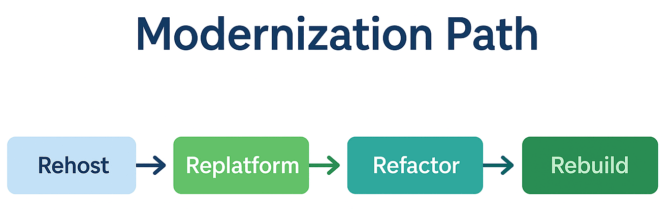 Most enterprises start with rehosting and replatforming, then progressively refactor over time — a pragmatic balance between innovation and risk control.